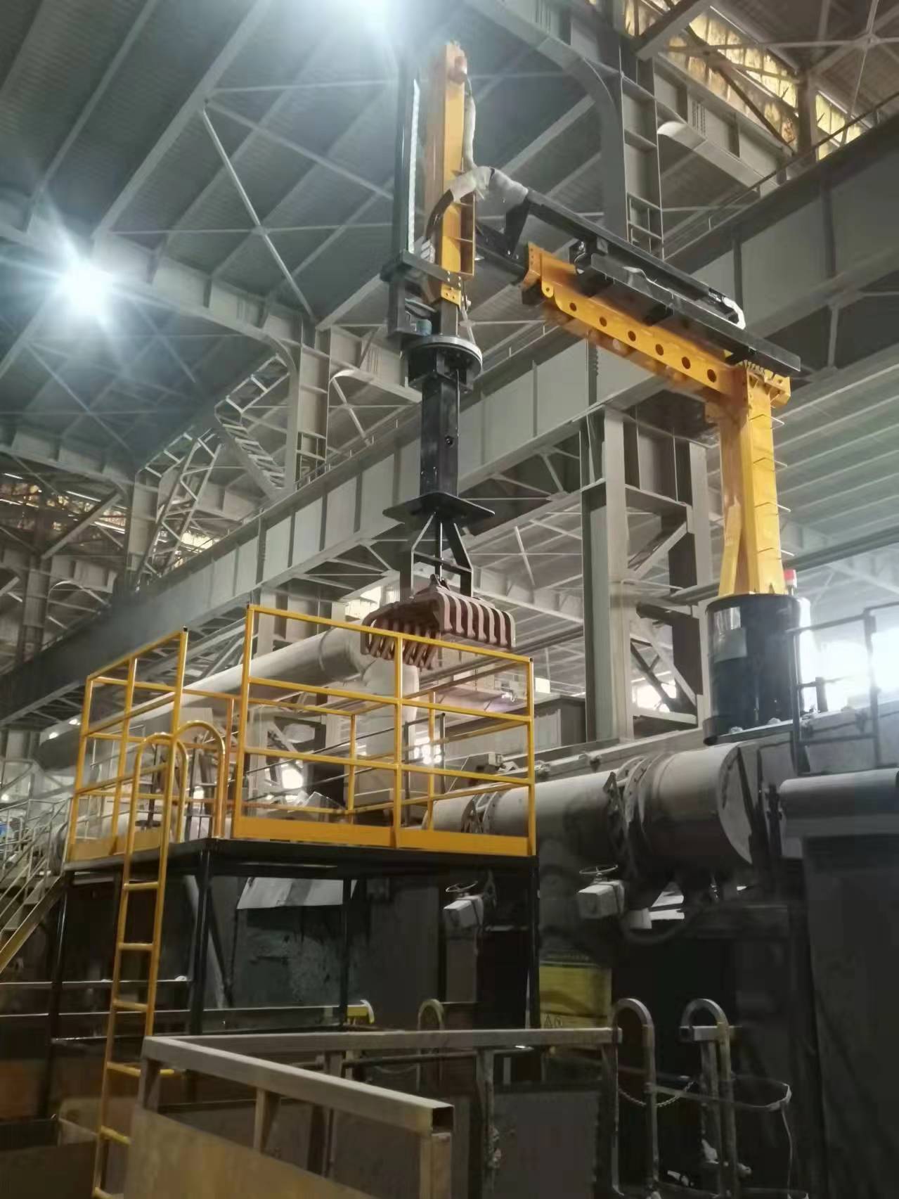 设备安装布置合理,结构采用高空悬梁结构,使炉周边作业空间开阔,减少磕绊造成的危险隐患,工作人员远离高温炉口通过遥控进行作业,避免因近距离作业造成的各种危险,因此安全性得到了有大的保障,并且大幅度减轻了作业人员的劳动强度。