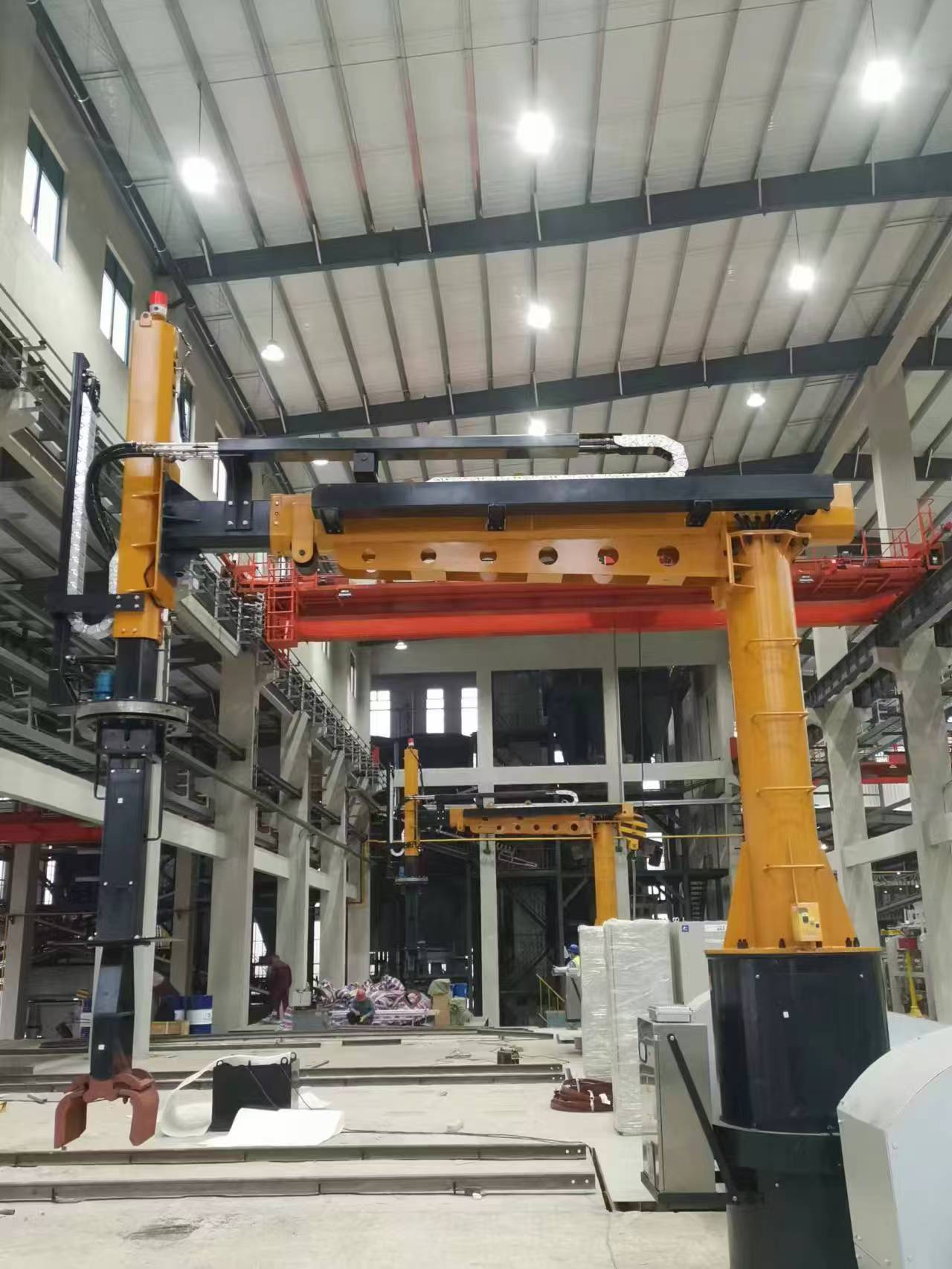 设备主体采用旋梁结构:悬臂的旋转由液压马达控制可360度旋转。副悬臂的伸缩和抓手的90度旋转、抓手的上升下降以及转手的抓取动作都由油缸控制。两台电炉可以共用一台捞渣机,捞渣机安装在两台电炉的在平台的中间位置。